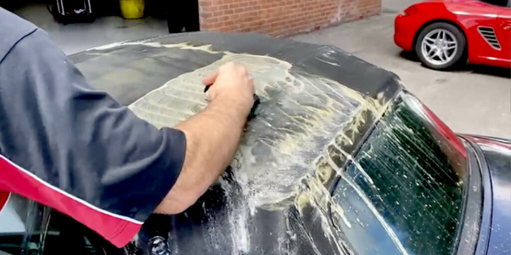 Stage 1. Our technicians will carry out the deep clean process using a specialist water based fabric hood cleaner to remove any ingrained dirt, algae and other contaminants from the fabric.